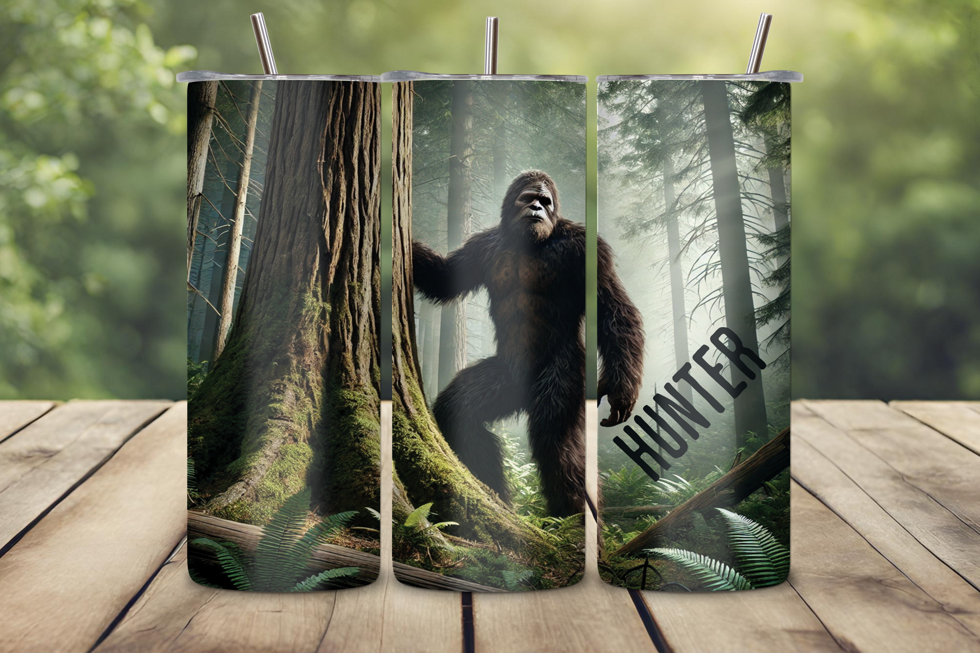 Embrace the mystery of the forest with the Sasquatch Hunter Tumbler! Featuring a lifelike depiction of Bigfoot in a misty woodland setting, this tumbler is perfect for adventurers and cryptid enthusiasts. Customize it with your name (up to 12 characters) for a truly personal touch!